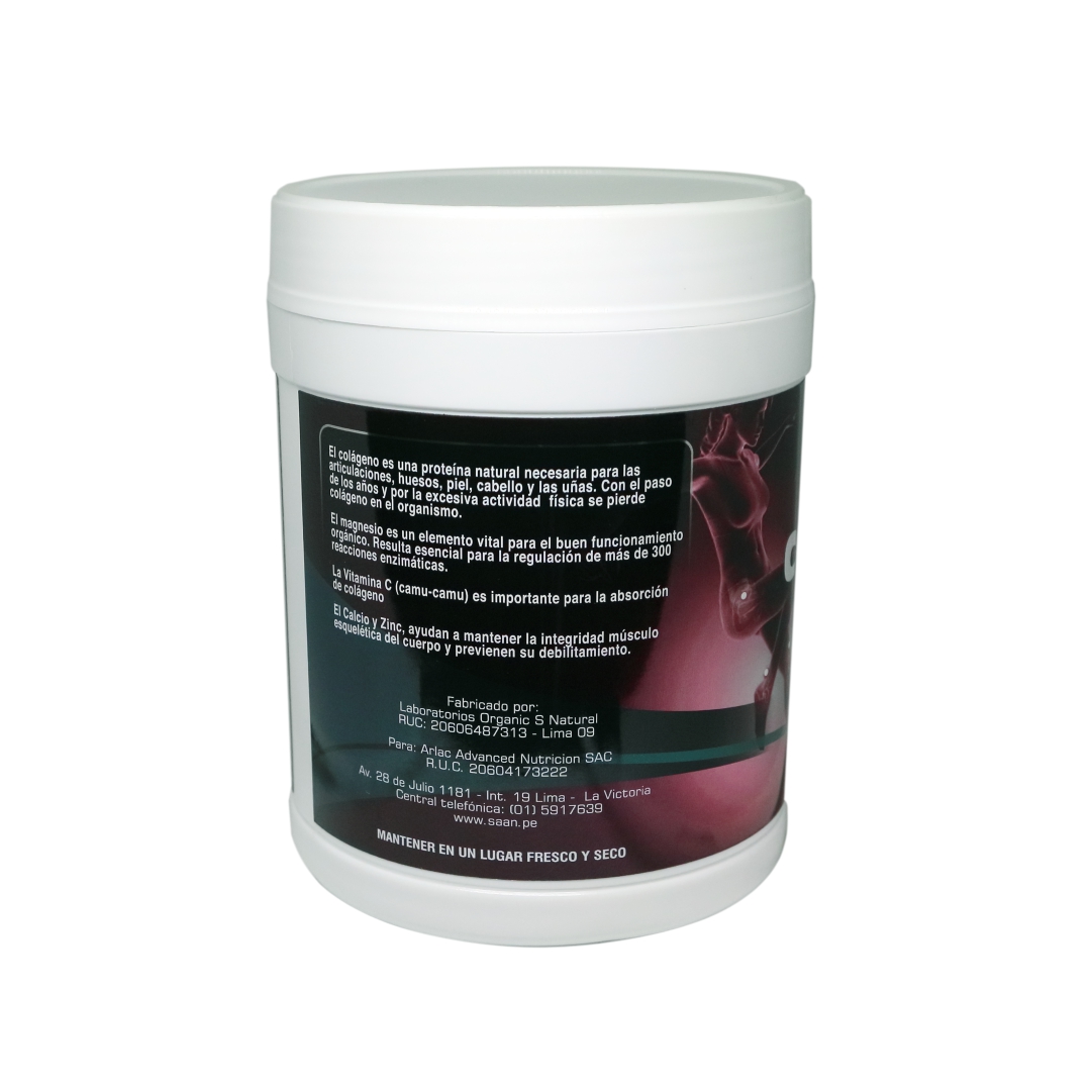 DESCRIPCION: Colágeno Hidrolizado, proteina que refuerza nuestra estructura osteoarticular, ligamentos y tendones. El calcio es uno de los minerales basicos para tener huesos fuertes. El Magnesio contribuye a la buena salud muscular. El camu camu posee abundante Vitamina C que ayuda a fortalecer el sistema inmunológico.