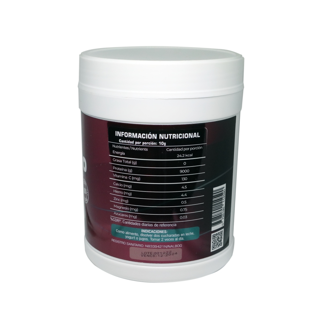 INGREDIENTES: Colágeno hidrolizado, camu camu, magnesio, stevia, zinc y calcio.